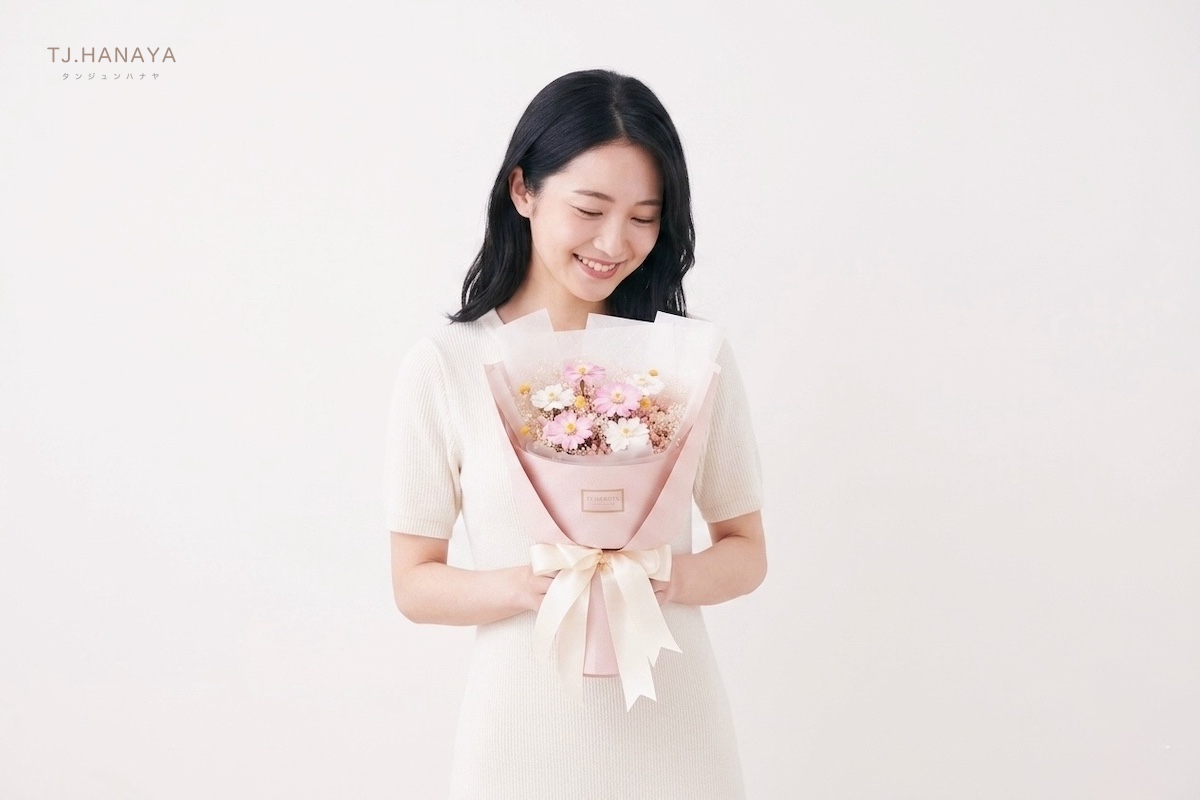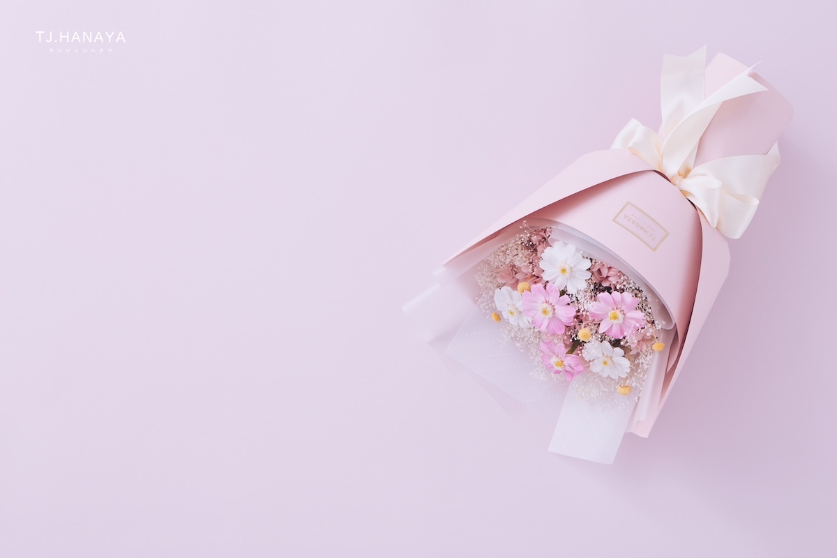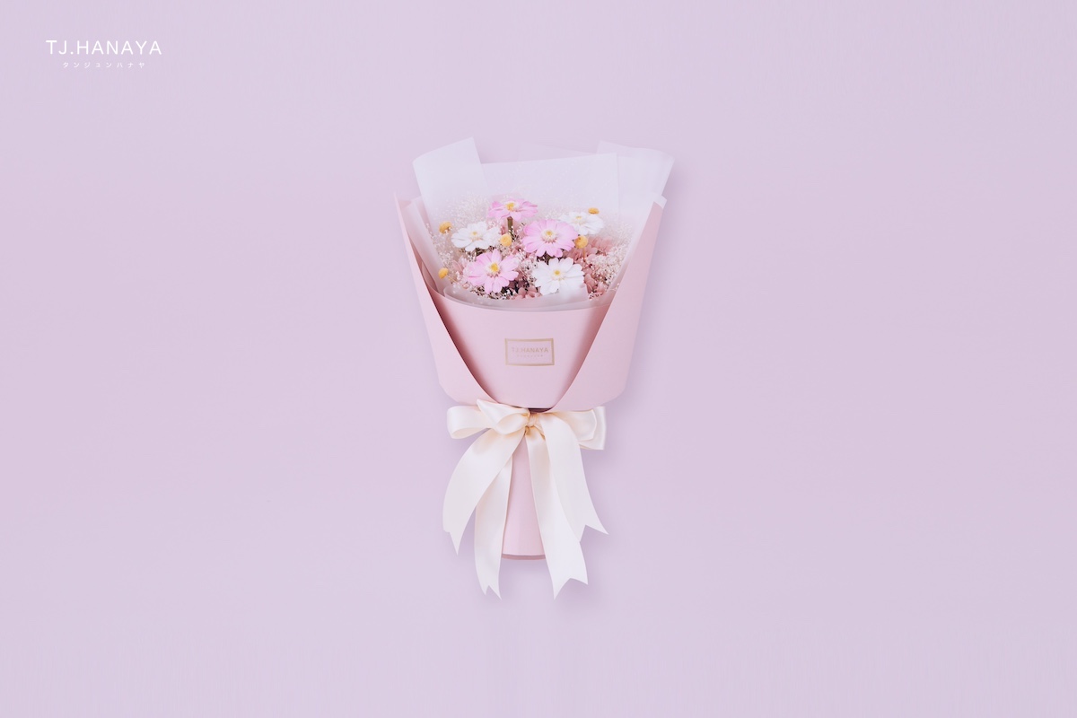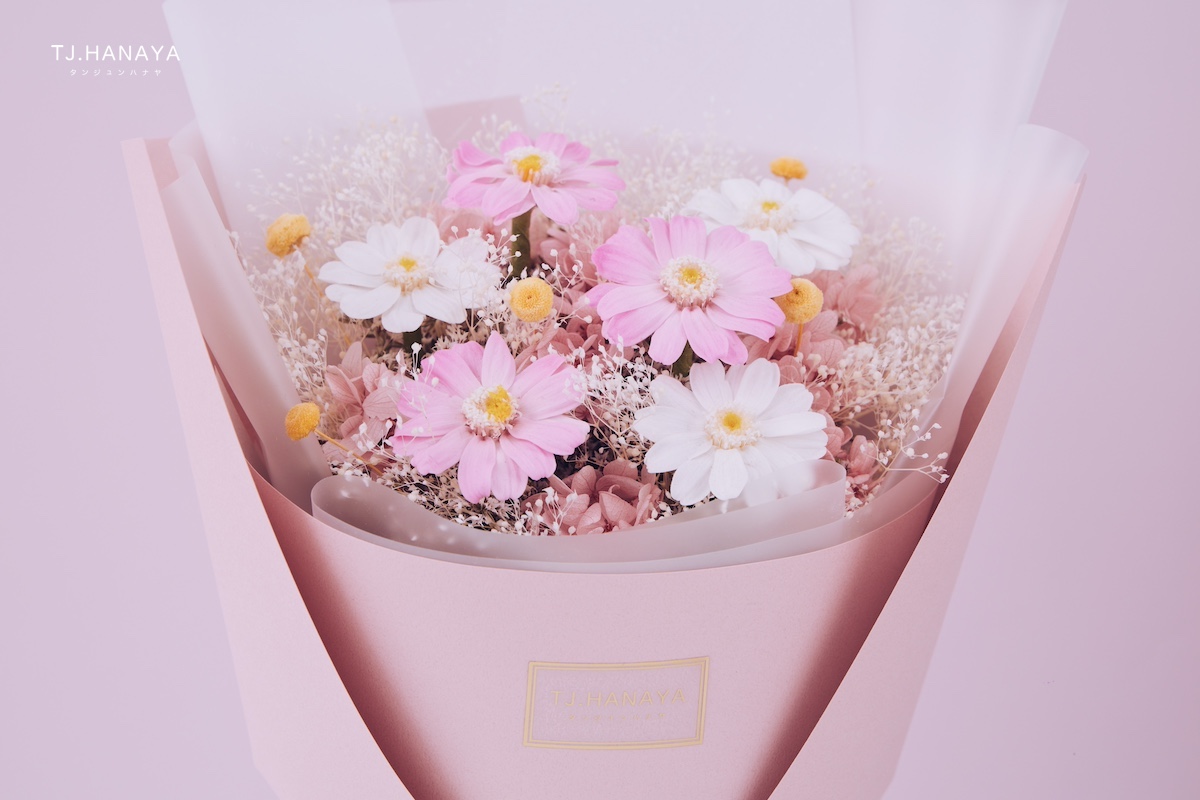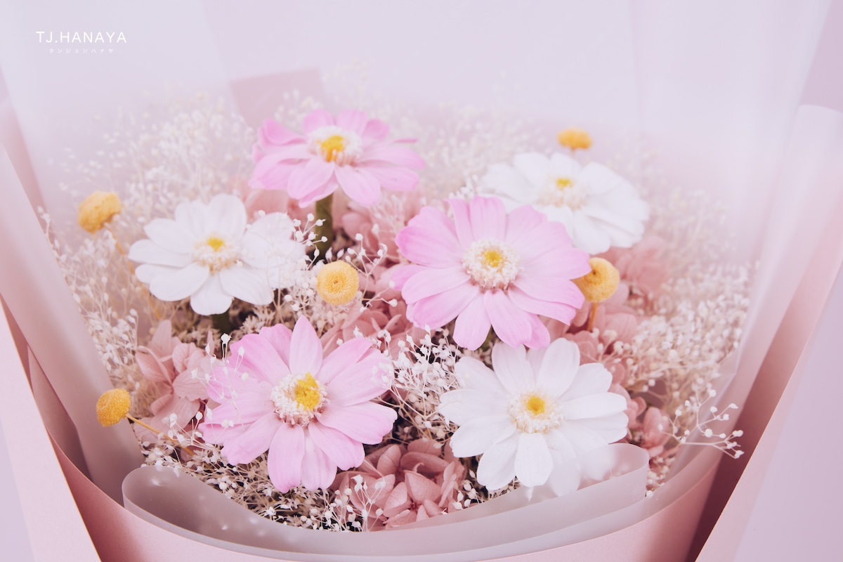 - 選用日本進口永生小雛菊,搭配滿天星草、繡球花及葉材,呈現精緻簡約的自然感花束。