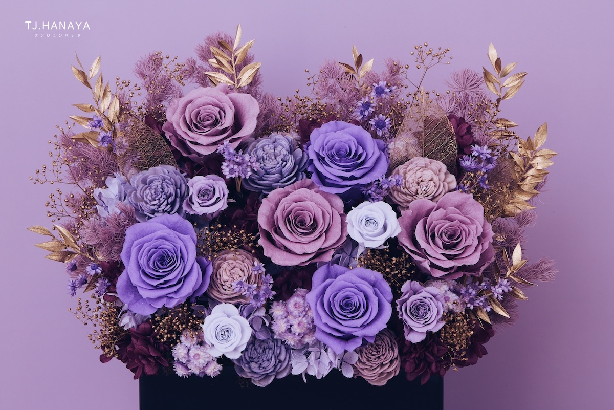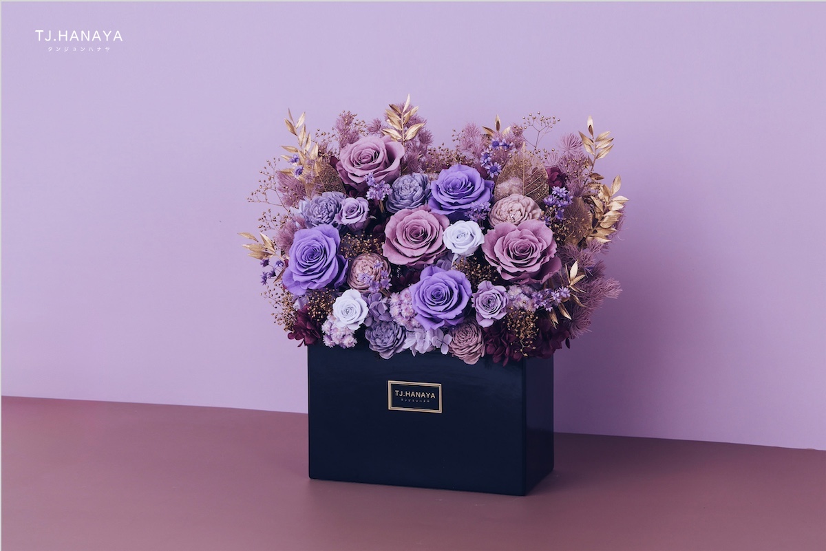 - 以漸層色為設計,選用不同色階的永生花材,營造出華麗而不甜膩的氛圍,無論送禮或居家擺設都很受歡迎。
