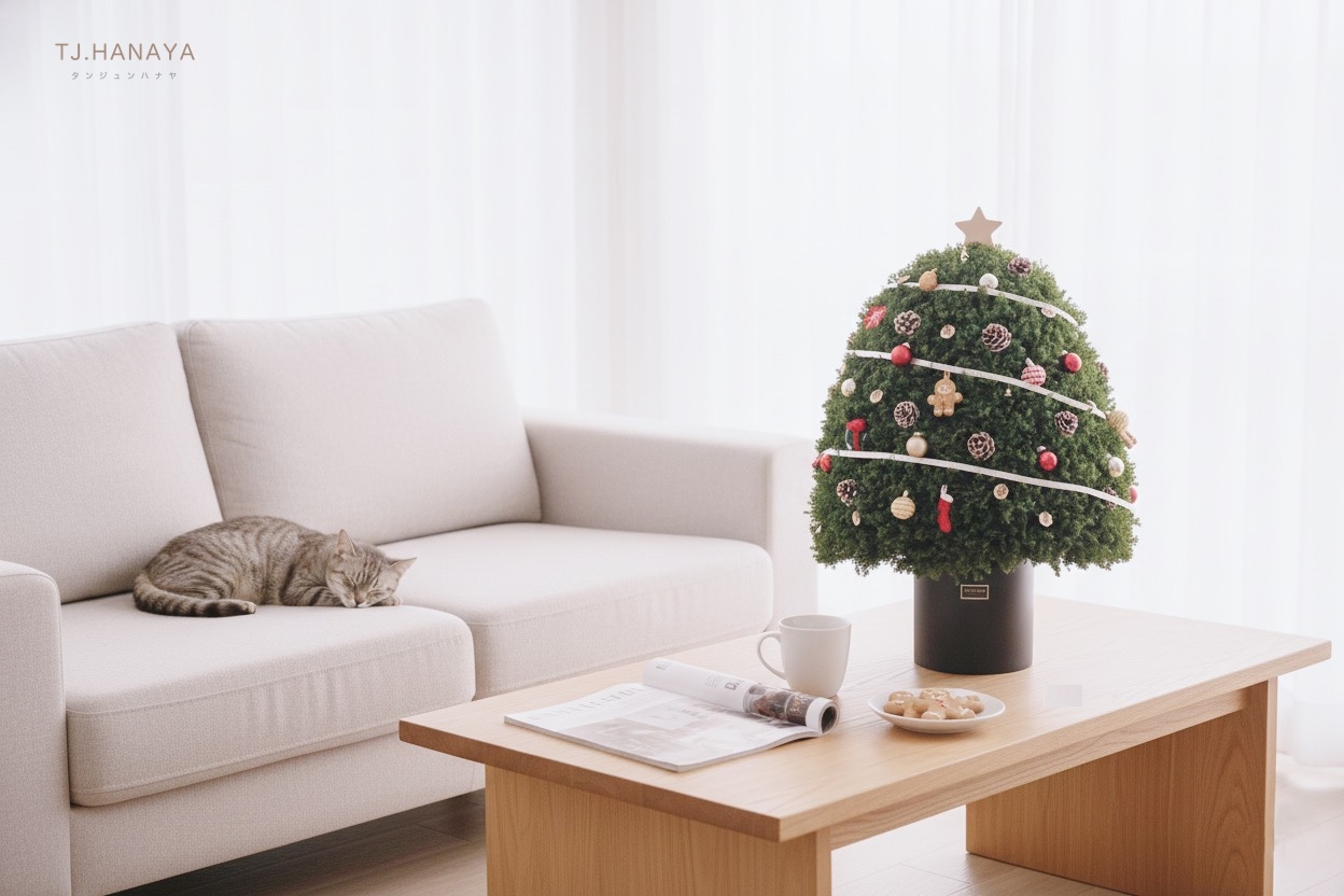- 整棵樹以永生雪松製作,搭配日本果實與針織裝飾,呈現冬日的歡樂氣息。