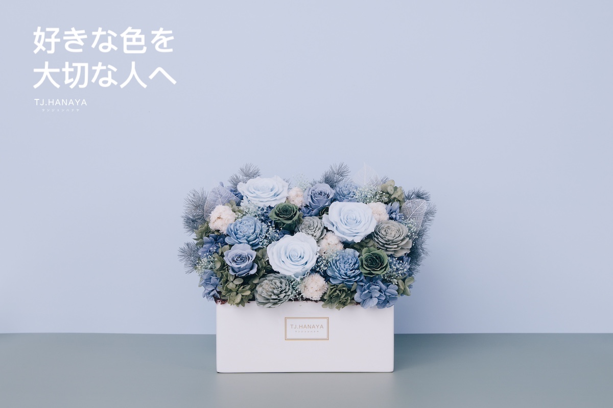 - 以漸層色為設計,選用不同色階的永生花材,營造出華麗而不甜膩的氛圍,無論送禮或居家擺設都很受歡迎。