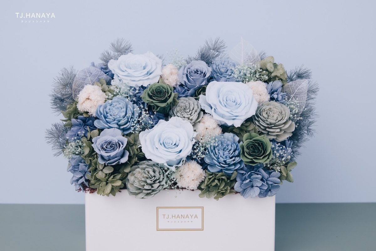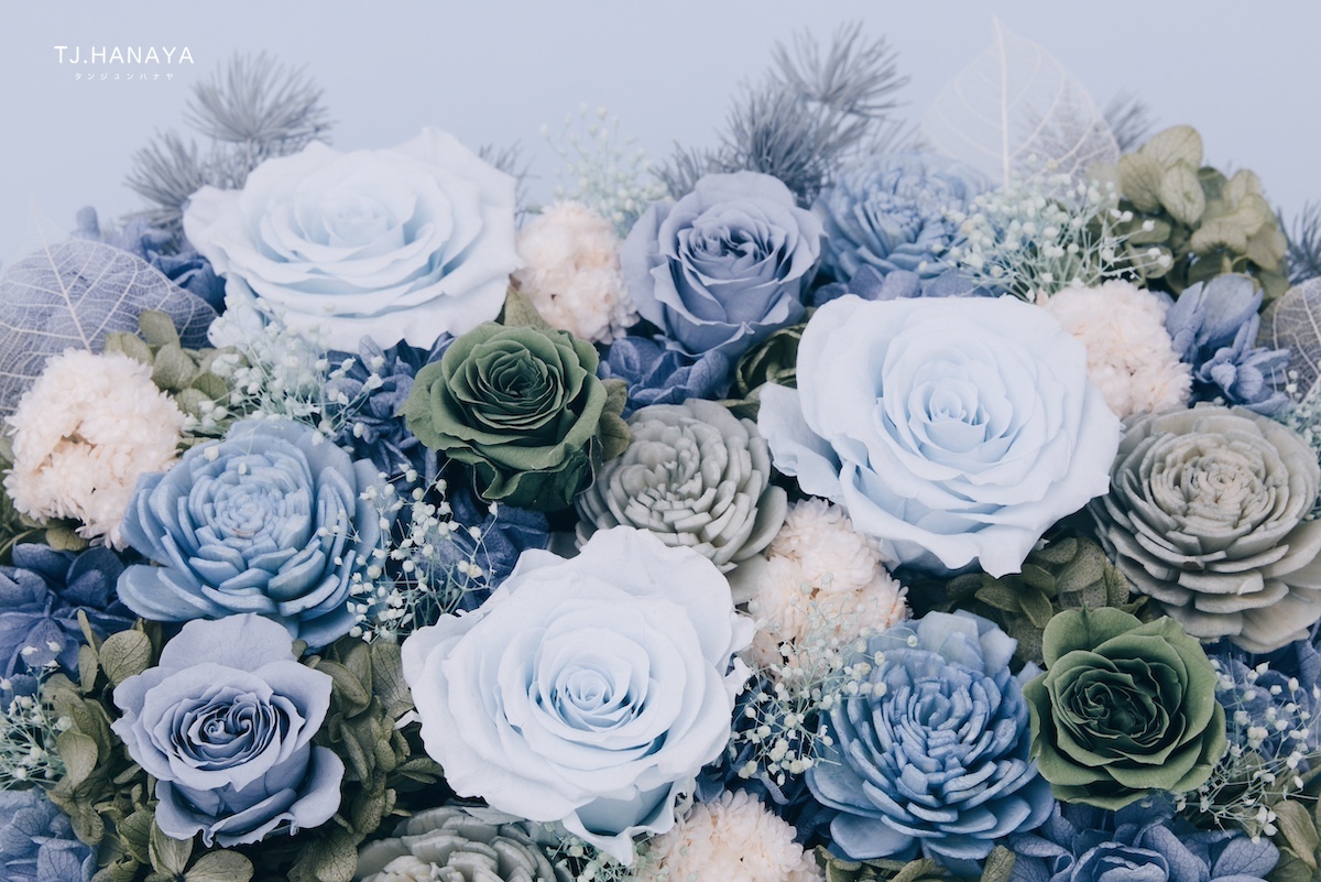 - 永生花請勿水洗、勿用濕布擦拭,也不建議噴香水、酒精、精油或各式噴霧於花材上,以免造成染色暈染或材質變質;若有灰塵,可使用冷風吹風機遠距離輕吹,或以乾淨柔軟刷具輕拂清潔即可。