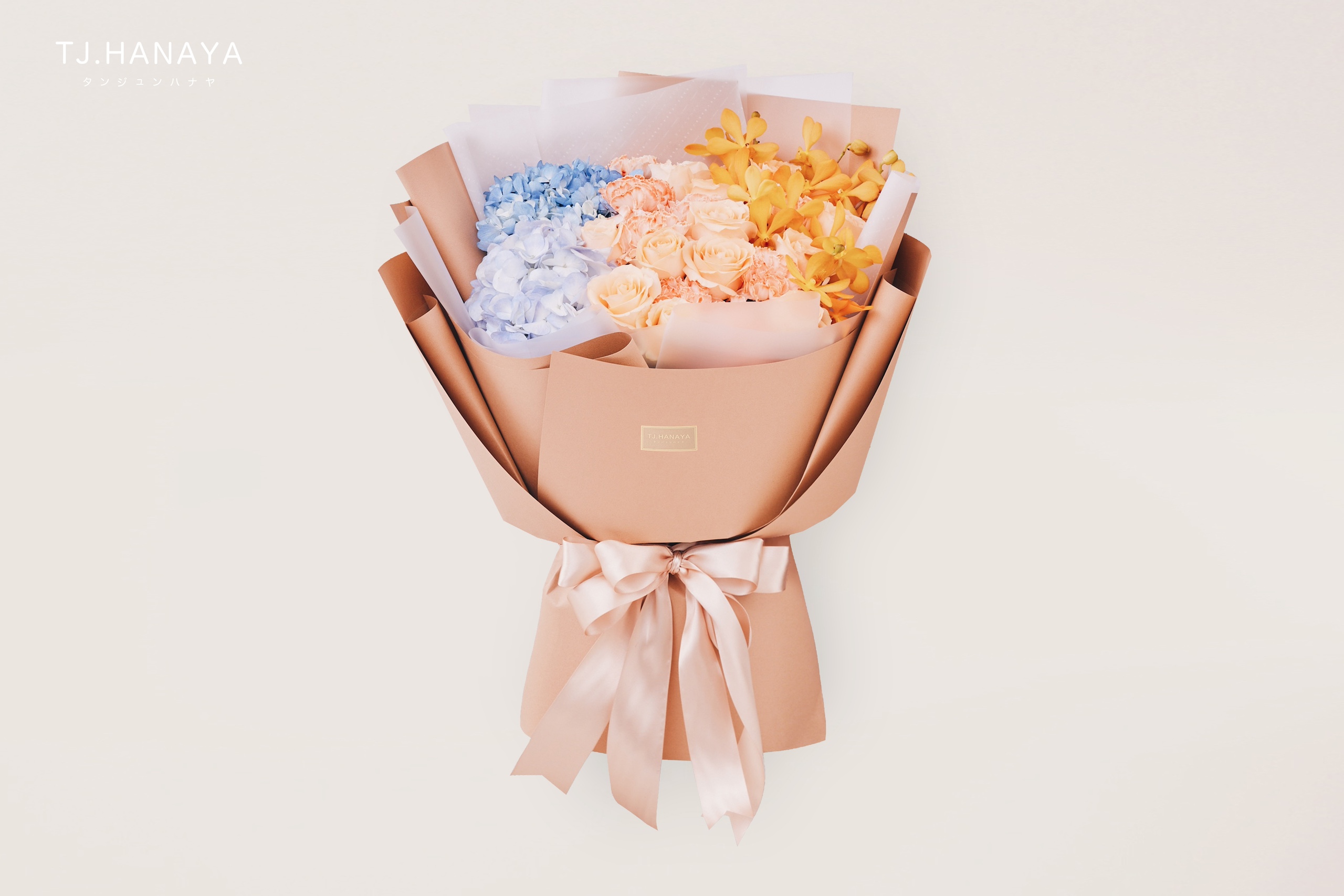 - 藍橙色系的搭配散發著暖暖的夏日氣息,非常適合作為恭賀升遷或是生日花束!