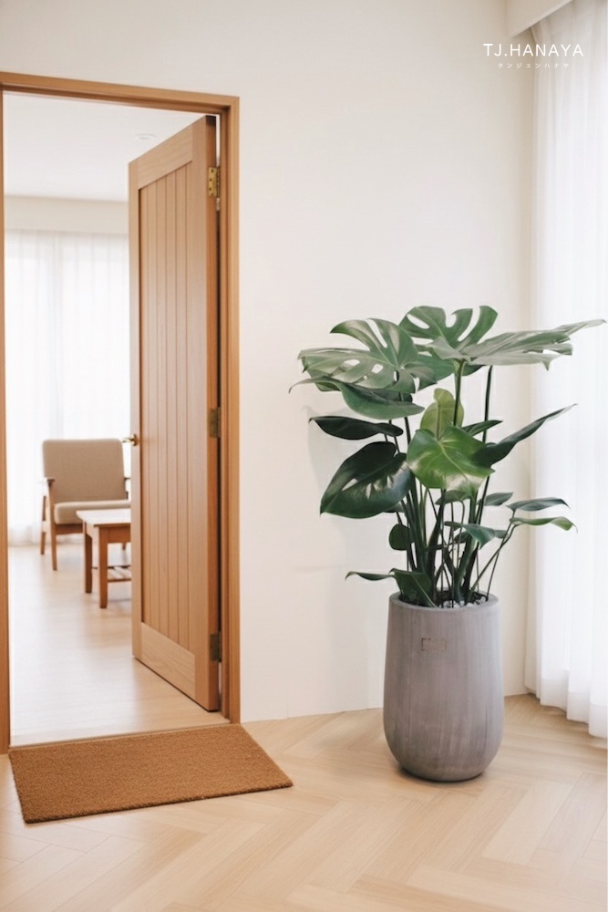 相較於千年木、白水木的安靜氣質,龜背芋更偏向「自然舒展、生命力強」的視覺,是許多現代日系、北歐風、工業風室內空間的必備綠植。