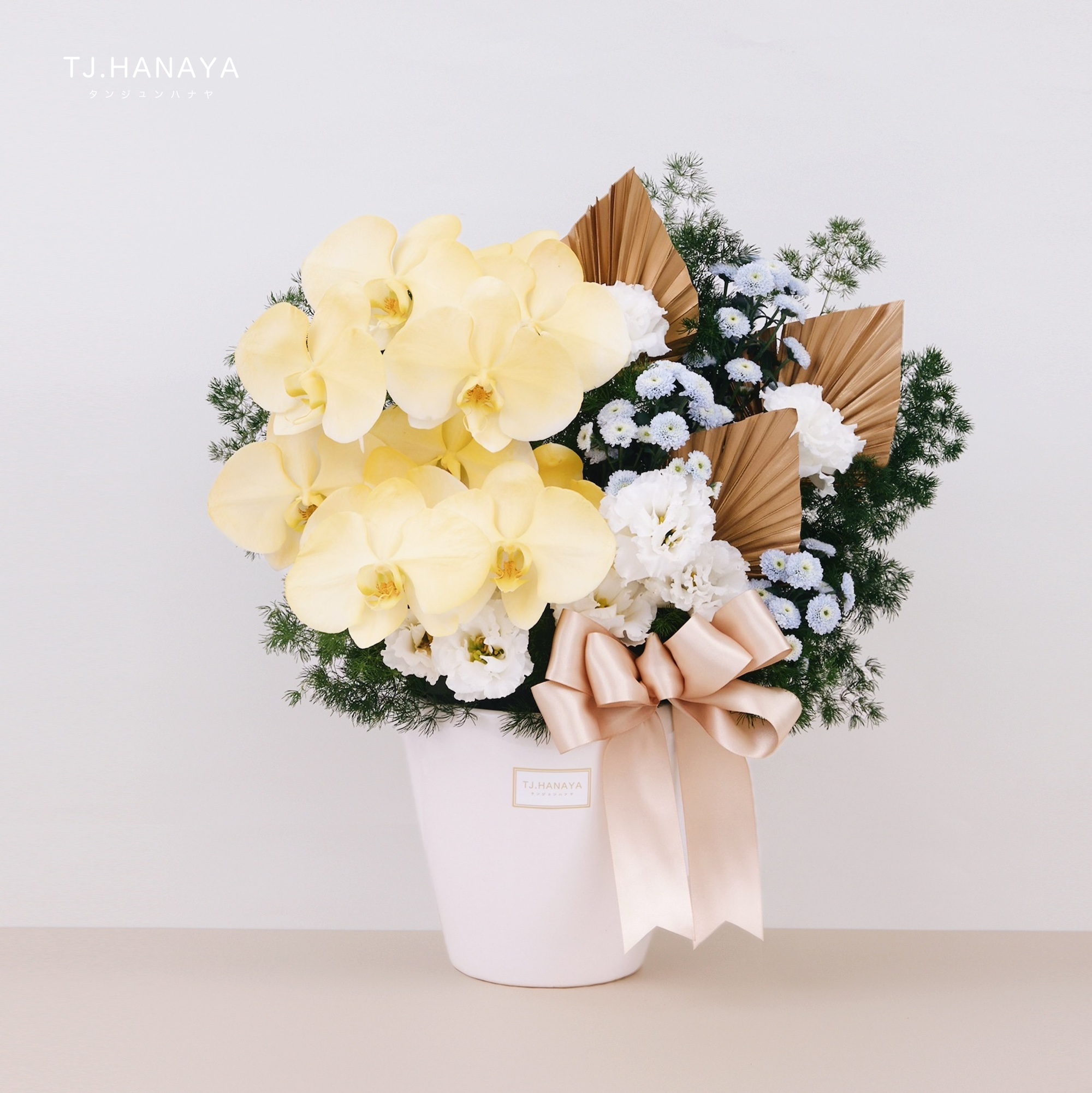 - 鮮花盆花皆為「單面花」,僅以正面作為觀賞目的,其背面皆以綠色葉材填補。