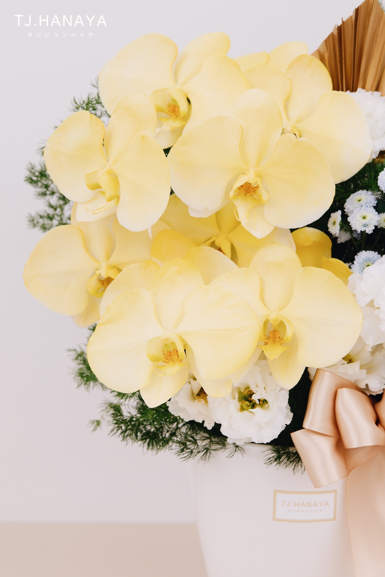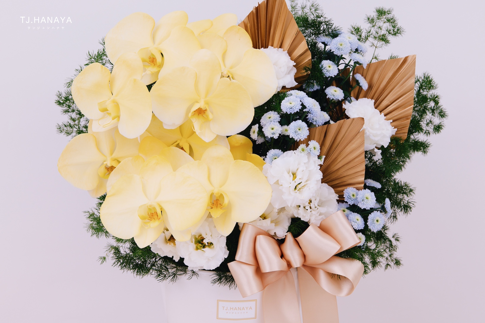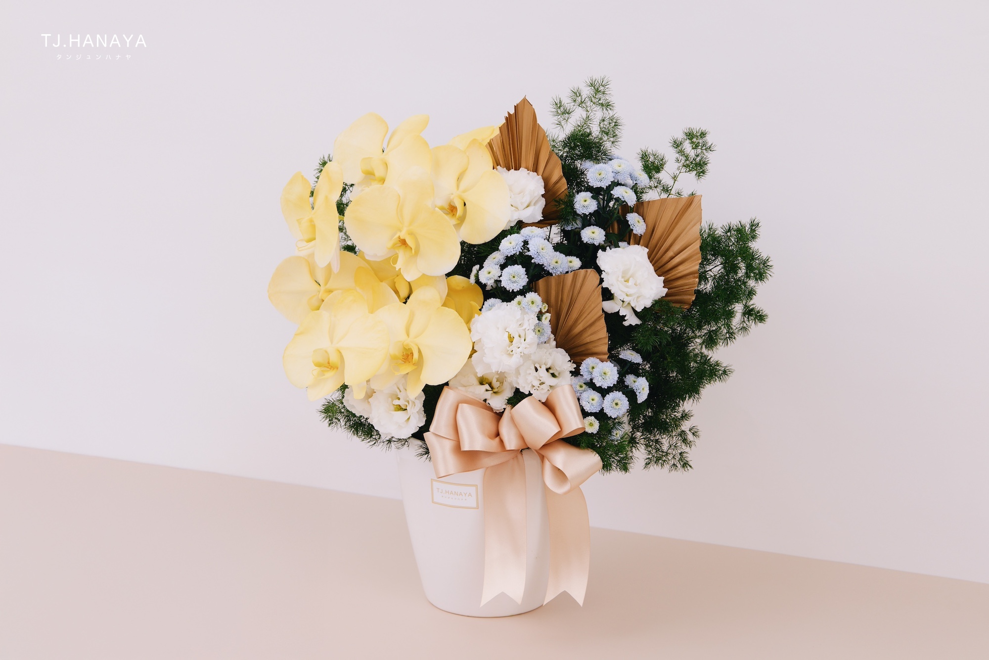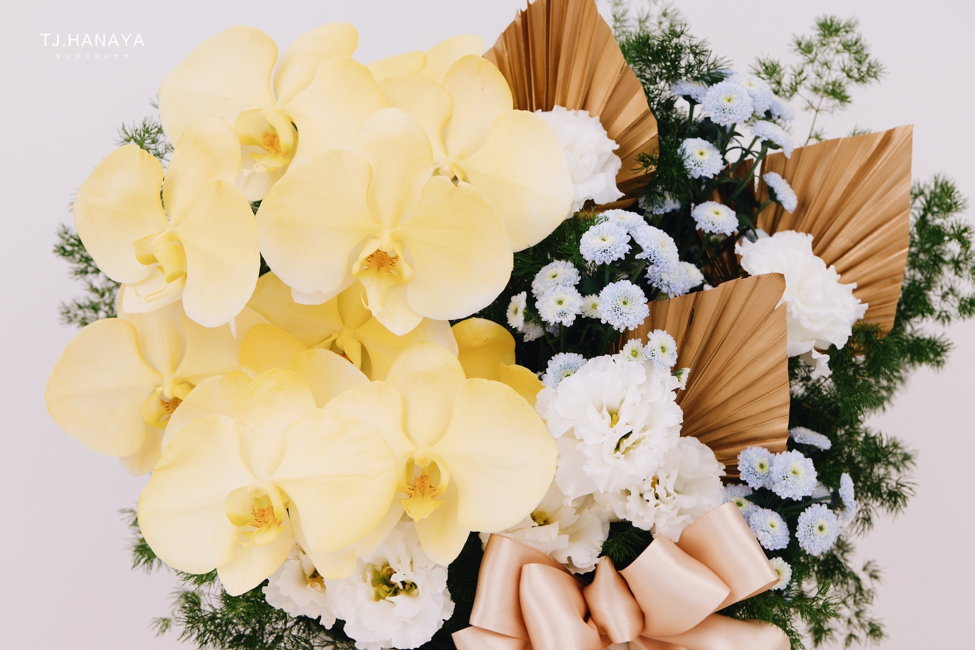 - 使用花材:噴色黃色蘭花、白桔梗、藍小菊